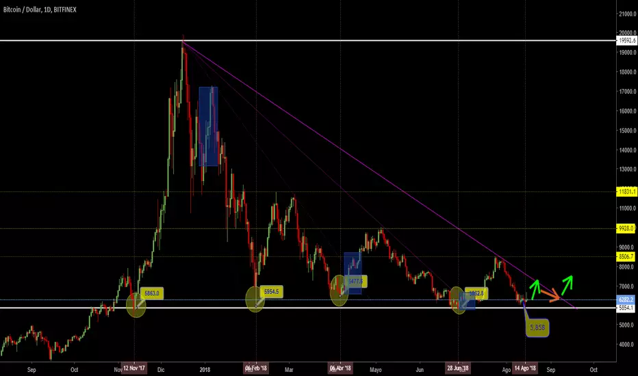 Repito que el precio soporte demostrado una y otra vez, desde noviembre 2017 es 5,800 (nov 2017, feb 2018, abril 2018, junio 2018 y agosto 2018) . Para explicar un poco el gráfico, las lineas moradas, representan las lineas de tendencia psicológica y se visualizan cada vez mas para mostrar la cercanía al tiempo actual. Dichas lineas se ven cruzadas por el precio y esto supone un cruces o ruptura (las rupturas se ven como rectángulos en azul) de la tendencia bajista. Pero cada vez que estas rupturas ocurren el precio alcanza un máximo, que a su vez nunca superan el máximo anterior, manteniendo y confirmando así que la tendencia bajista continua.