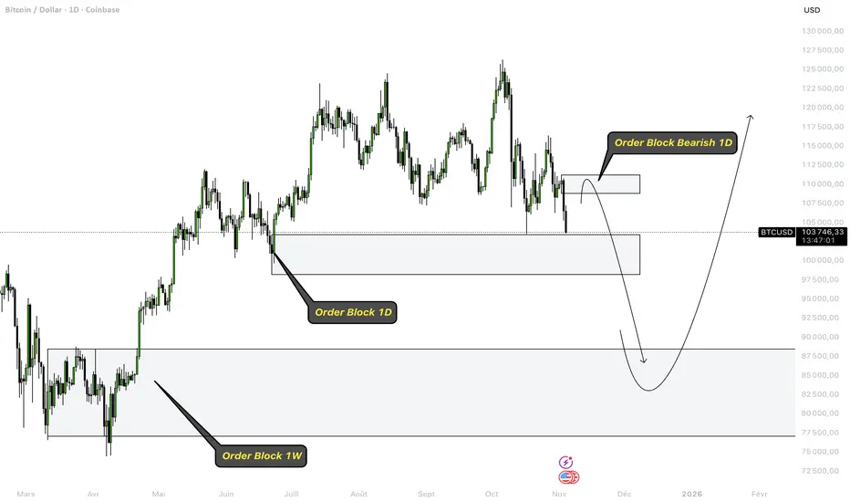 📉 Si nous clôturons aujourd'hui sous les 103500$ nous validerons une structure baissière en créant un BOS (Break of Structure) et l'OB situé à 108870$ deviendra une magnifique zone de vente.