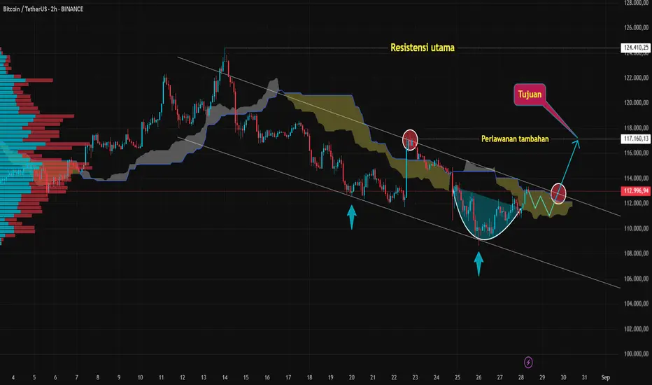 BTC telah melarikan diri dari tepi bawah saluran dan membentuk cangkir kecil dan model pegangan di area dukungan 110.000 - 112.000. Setelah rentang yang kuat, harganya menguji awan Ichimoku dan area tambahan 113.500 - 114.000.