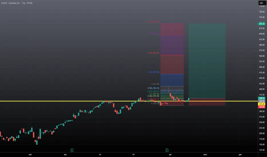 מה שאנחנו עדים לו במניית CVNA הוא שלאחר זינוק של המניה בדוחות המניה ביצעה תיקון עד לרמת 0.23 של פיבונצ'י מה שמעניק לה יעד גבוה כלומר היא נמתחה מאוד כלפי מטה.