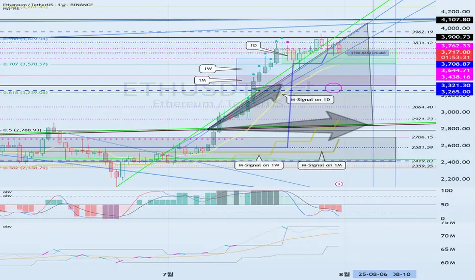 현재 3265.0-3762.33 구간에 걸쳐 1M, 1W, 1D 차트의 HA-High ~ DOM(60) 구간이 형성되어 있습니다.