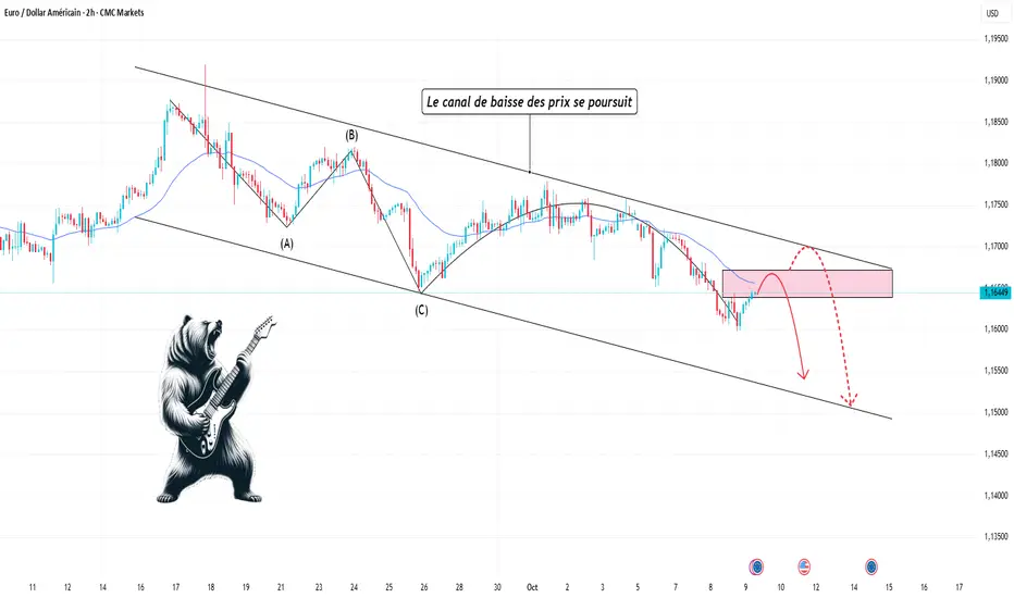 L'EURUSD évolue régulièrement dans un canal clairement baissier, reflétant une tendance négative soutenue.