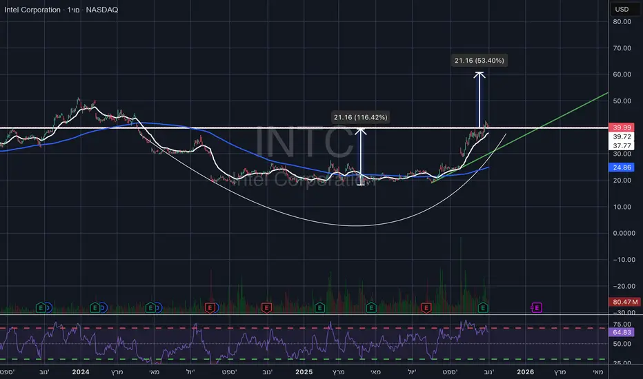 INTC פרצה לפני מספר ימים את התבנית של ספל וידית , עכשיו המחיר חזר לבדוק את קו התמיכה , כאשר ניתן לראות התחלה של כניסת קונים בנר האחרון , אז כל עוד התמיכה מחזיקה ויש ווליום חיובי , קיבלנו היזדמנות כניסה או חיזוק פוזיציה והמשך עליות