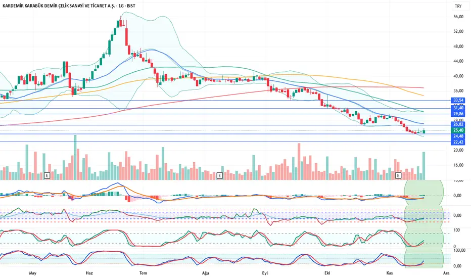 Günlük teknik indikatörler Pozitif. Hisse 24,48 desteğini oluşturduktan sonra bu seviye üzerinde kalmayı başarmış gözüküyor. İndikatörlerinde alt konumdan yukarı yönelerek pozitif göstermesi olası bir yükselişin habercisi olabilir. Hisse 21 günlük fiyat ortalamasını (27,22)yukarı kırıp ortalaması üzerinde kalmayı başarabilir ise desteğin artma ihtimalini yükseltebilir. Bu durumda 200 günlük fiyat ortalamasına doğru (36,84) bir hareketlenme imkanı yaratabilir. Olası negatiflikte ise 22,42 desteği önemli bir yer olacaktır.