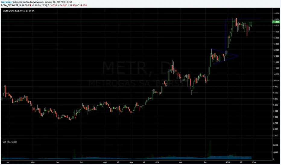 Después de varios días de boyar en el mismo nivel, sorpresivamente pego un salto muy importante quebrando la resistencia de 15. Pero hago una aclaración: esto NO ES UNA BANDERA. Puede llegar al objetivo o no, pero no lo es.פרסומים קשורים