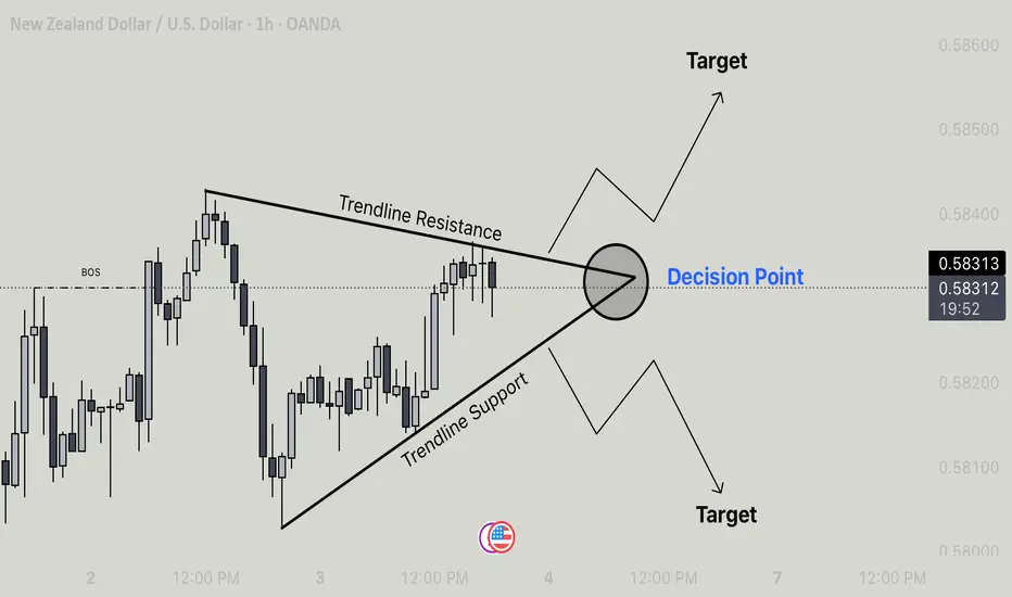 • The apex (where the two lines converge) is marked as the Decision Point. This is where price is likely to break out, either upward or downward.