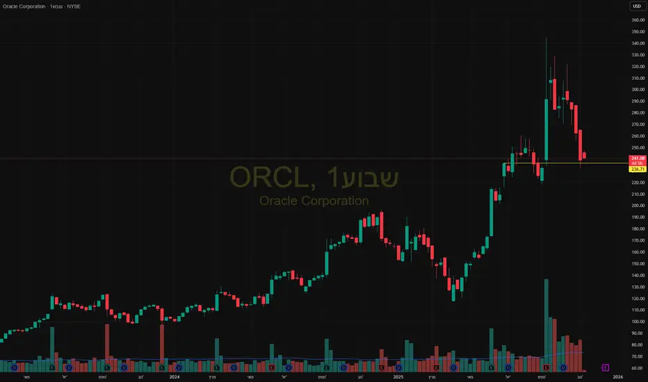 לאחר ראלי חזק במיוחד שהחל בסוף 2024 והמשיך לתחילת 2025, מניית Orcl נכנסה לתיקון בריא וירדה חזרה לאזור ביקוש משמעותי בטווח 235–245 דולר.