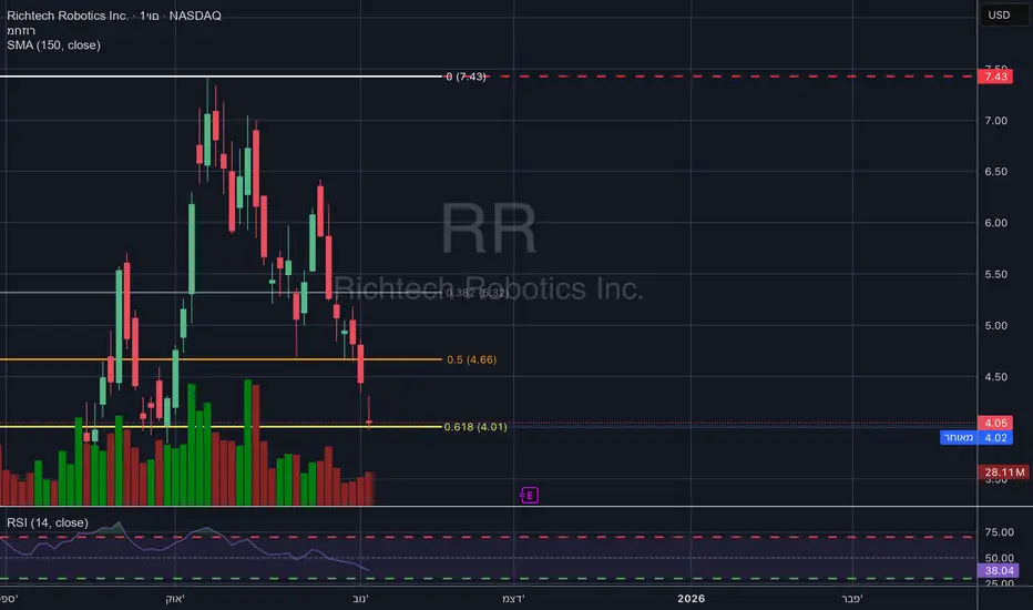 המניה Richtech Robotics (RR) תיקנה כ־46% מהשיא הקודם ונמצאת כעת על רמת הזהב של פיבונאצ’י (0.618) סביב $4.00 – אזור שבו לעיתים מתחיל מהלך עליות חדש.