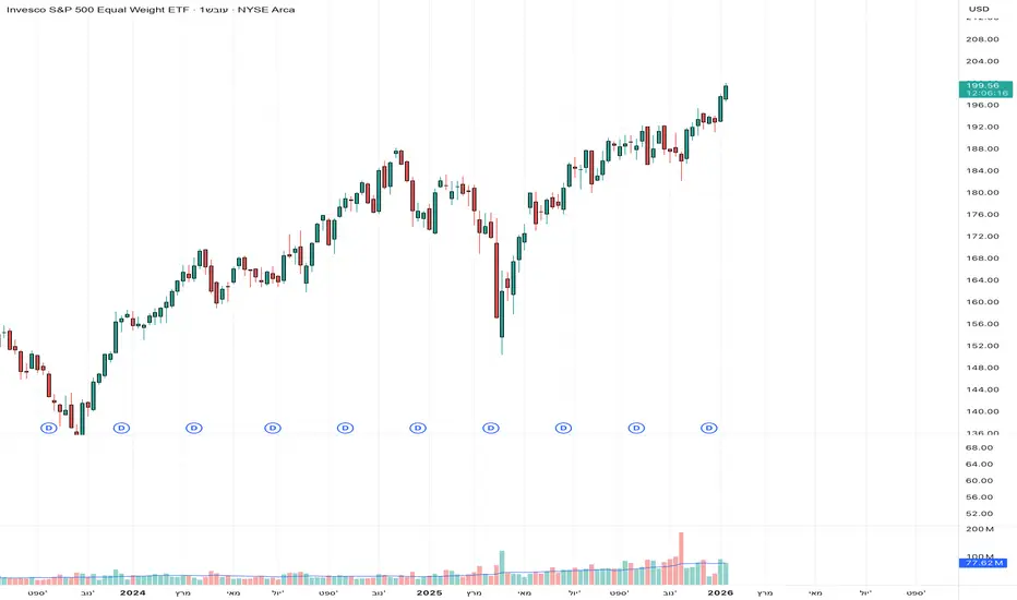 כשאתה רואה שווי RSP עולה הרבה יותר מה-SPY, זה אומר שאחת האפשרויות היא שהכסף עוזב את הענקיות ועובר לשאר השוק. זה לא משהו לפחד ממנו. רק לעקוב ולהצטרף.