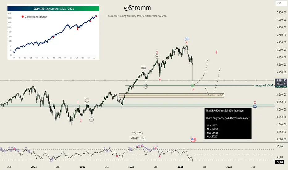 Man muss es einfach so sagen: Was wir gerade beim S&P 500 sehen, passiert nicht oft. Es ist tatsächlich erst das vierte Mal in der Geschichte, dass der Index in nur zwei Tagen (okay, eigentlich drei mit dem heutigen Montag) mehr als 10 % verloren hat. Die anderen Male? Oktober 1987, November 2008 während der Finanzkrise – und März 2020 zu Beginn der Pandemie.