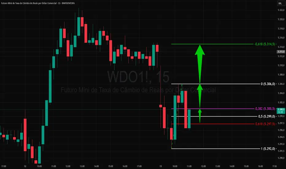 No gráfico de 5 minutos do WDO, retraiu até 61,8%, voltou a subir até a linha de 38,2% e poderá seguir subindo, se romper os níveis da retração, fizer pullback e seguir pra cima. Os círculos amarelos mostram o grupo de 3 candles rompidos para originar os topos e fundos.