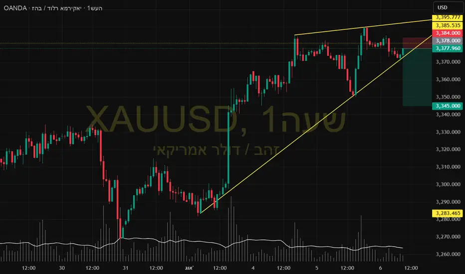 הזהב יצר טריז עולה, בדרך כלל תבנית דובית. המחיר דחה לאחרונה את אזור ה-3,390 דולר (השיא של אתמול) ומתחיל להיחלש.