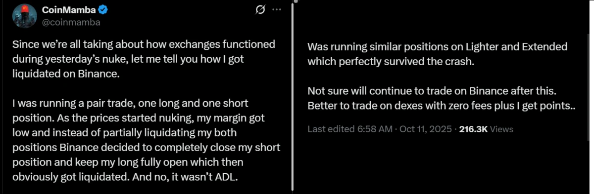 Hyperliquid, a perpetual decentralized exchange, reported that $2.6 billion in bullish positions were forcefully closed. Meanwhile, traders on several platforms, including Binance, reported issues with portfolio margin calculations. At the same time, DEX users complained about auto-deleveraging, which occurs when counterparties fail to meet margin requirements.