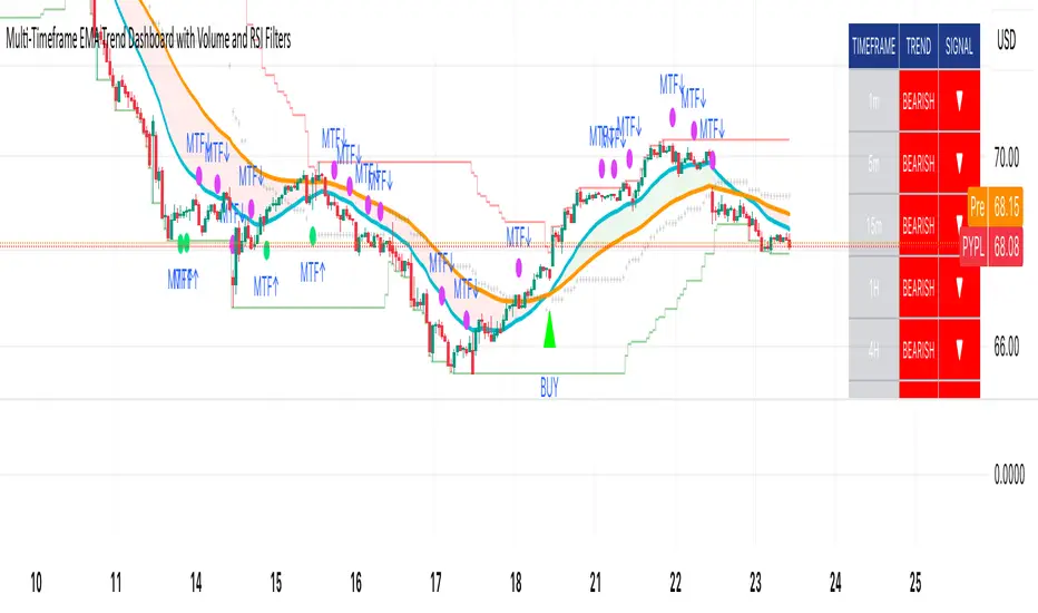 Multi-Timeframe EMA Trend Dashboard with Volume and RSI Filters