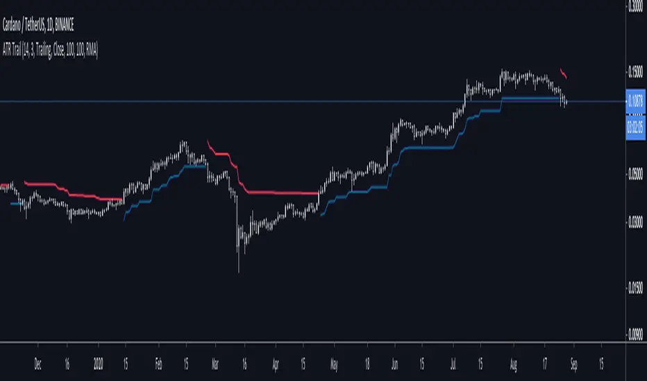 In Trailing mode, it displays the same ATR line, except the line trails until price crosses it. When price crosses it, it flips from long to short or vice-versa.