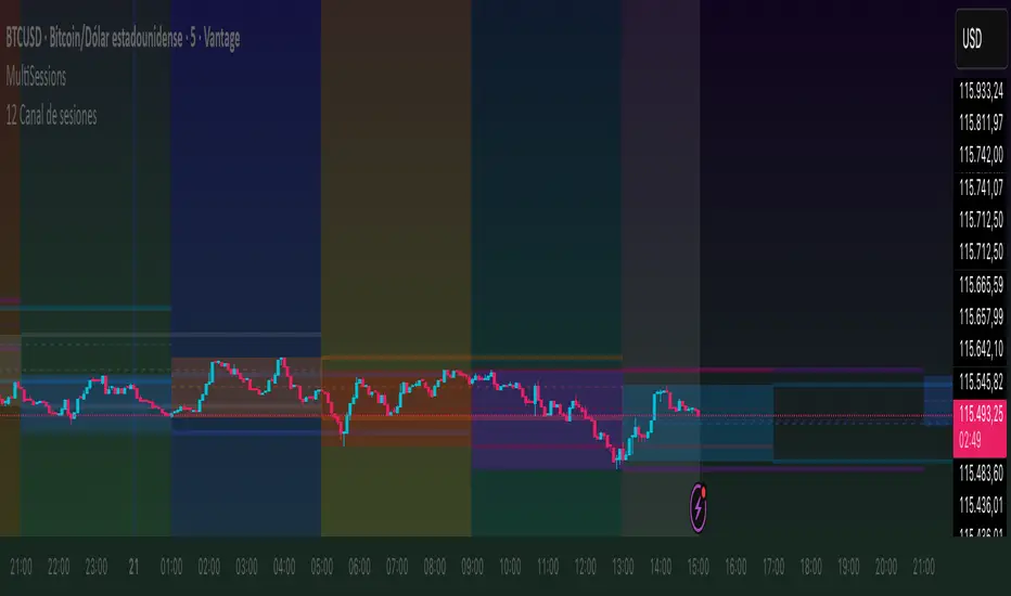 Intraday tool that plots up to 12 sessions with three time fields per session: Start, Session End (box limit), and Line End (right-side extension). Ideal for ORB workflows and time-blocked trading (London, NY Open, power hours).