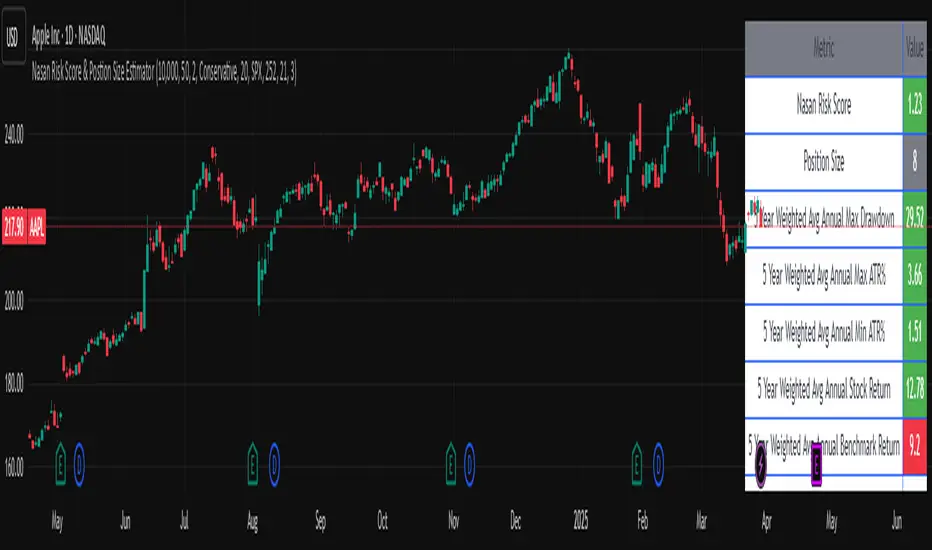 The Nasan Risk Score & Position size calculator takes into account all the listed parameters into account and estimates a Risk %. The position size is calculated using the estimated risk % , current ATR and a dynamically adjusted ATR multiple (ATR multiple is adjusted based on true range's volatility and stocks relative performance).