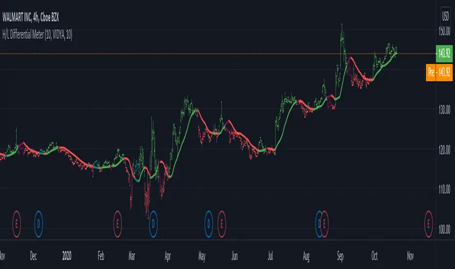 Yet another trend follower that is based on a very simple principle: Take the highest high and lowest low from a user defined bars back period, do an average between them and smooth them up with 3 possible moving averages, VIDYA, EMA and SMA, while VIDYA is the default.