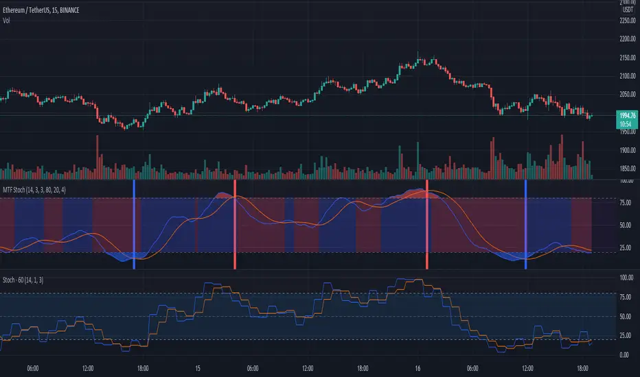 Here is a version of a MTF Stochastic script I wrote a while ago. The code is based on a formula written by Peter_O and the built in Tradingview Stochastic indicator. See this link to the original script of Peter_O. I use this formula a lot if I want to build in a Stochastic trend filter in my strategies. In this version I added options to plot different signals and trends.
