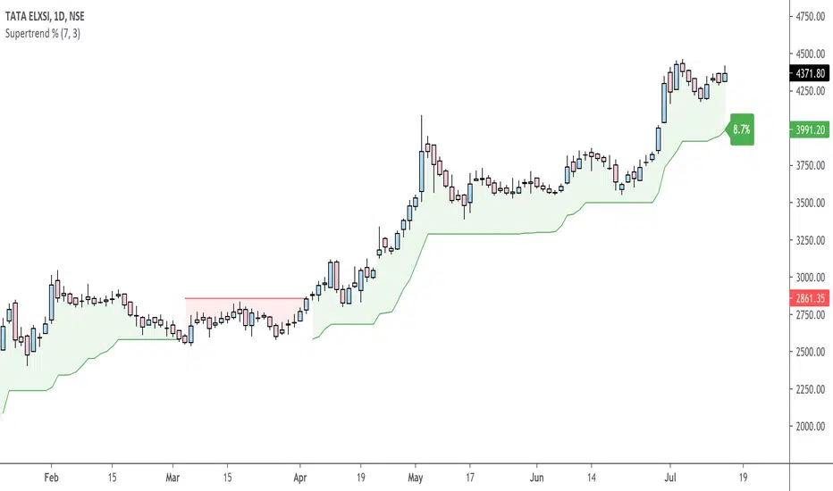 This comes in handy when one is using the Supertrend value as a stoploss level. For instance, one would like to have a maximum stop loss level of 8%. Instead of calculating how much percent the price is away from the Supertrend, one can look at the percent label & make an informed decision as to whether initiating a position would have favourable risk/reward or not.