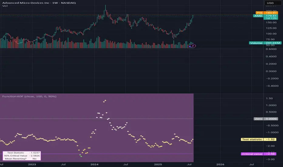 Augmented Dickey-Fuller test (ADF), The ADF test is a statistical method used to assess whether a time series is stationary – meaning its statistical properties (like mean and variance) do not change over time. A time series with a unit root is considered non-stationary and often exhibits non-mean-reverting behavior, which is a key concept in technical analysis.