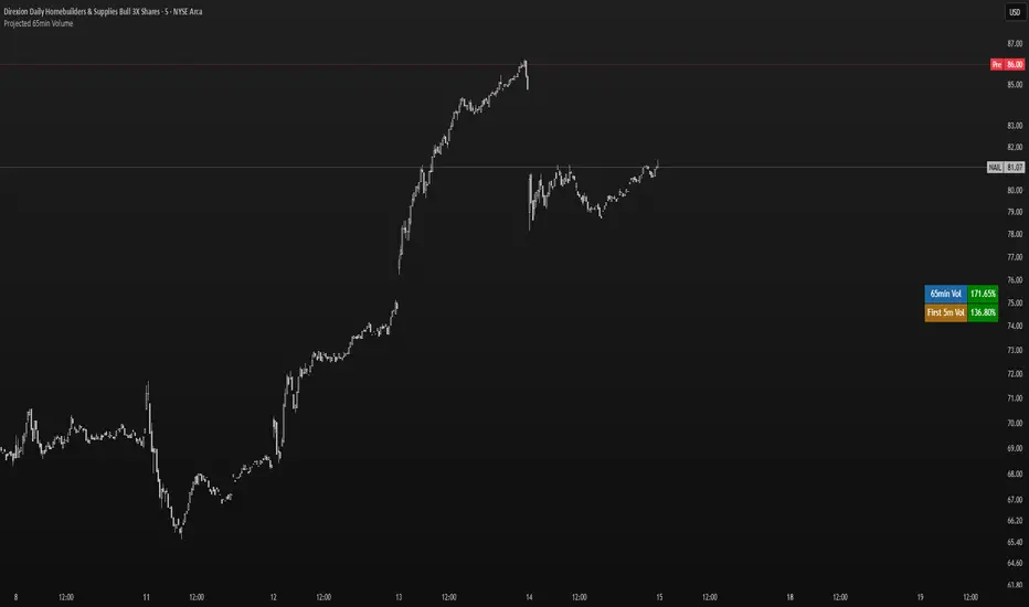 The script provides relative volume for the first 5min candle after its close vs 14 avg and estimates projected volume for the first 65min candle in the trading session vs avg value.