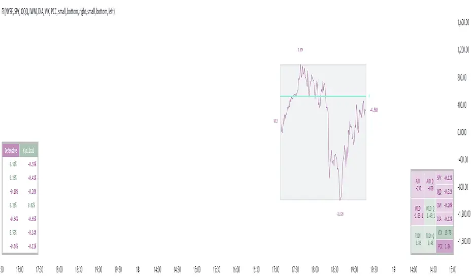 This is a small but powerful indicator that analyzes the inflow and outflow of each exchange's underlying securities. When all the markets are in harmony, it will print a green or red symbol below the tick chart. We have also included this signal within the internals table labeled “trending,” which is simply the same signal presented in a more apparent area. Alerts can also be set with these signals to take advantage of the system across tickers.