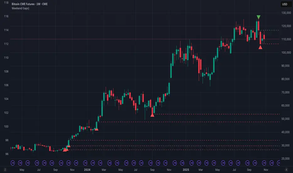 Identify unfilled gaps between the close of one candle and the opening of the next. Optimised for weekends by highlighting friday gaps with a triangle and bold horizontal ray. Depending on the price action required to fill it, they are marked in red or green.