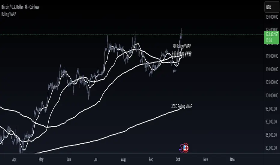 Rolling VWAP is a continuously updating VWAP that doesn’t reset at fixed anchors like daily or weekly VWAP.