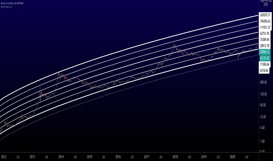 Logarithmic regression of the USD price of Bitcoin , calculated according to the equation: