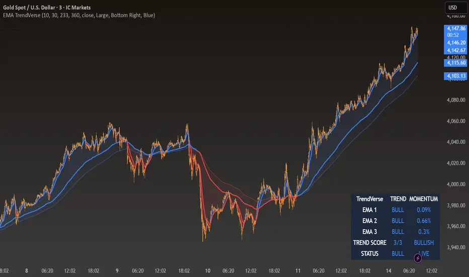 EMA TrendVerse analyzes the relationship between four exponential moving averages to give you a complete picture of market trends. The intuitive color system immediately shows you which way the wind is blowing . The dashboard provides real-time updates on trend direction and strength.
