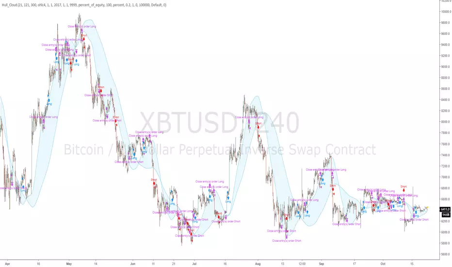 3 Hull Ma's, cloud is made by the Mid and Long Hulls, entry and exit rules calculated with Short Hull (normal crossover) and edges of cloud