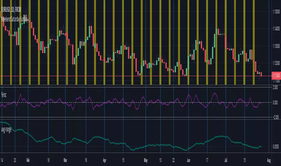 Plots the average range of current symbol, in a particular resolution (daily by default) averaged across a configurable period (20 by default). Increase or decrease precision through the UI to make it better applicable to your instrument. The default precision is set to 4, useful for most forex pairs pip counting (multiply by 10,000 to get the pip value). But for USDJPY, you might change it to 2 (multiply by 1,00 to get the pip value). Range is defined as (high - low).