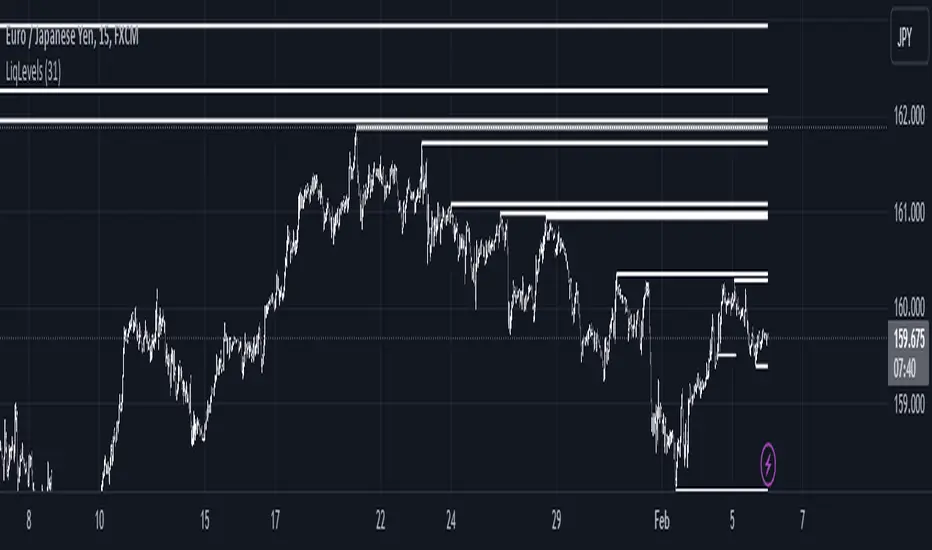 The "Liquidity Levels" indicator on TradingView is designed to identify and highlight liquidity levels in the market. This indicator is based on pivot highs and lows with an adjustable offset to adjust the importance and length of the identified levels.