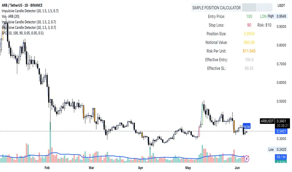This indicator provides a real-time position sizing calculator designed for fast momentum trading. It instantly calculates optimal trade size based on your risk parameters, entry/exit prices, and exchange conditions (fees/slippage). Perfect for high-speed entries during candle closes and breakouts.