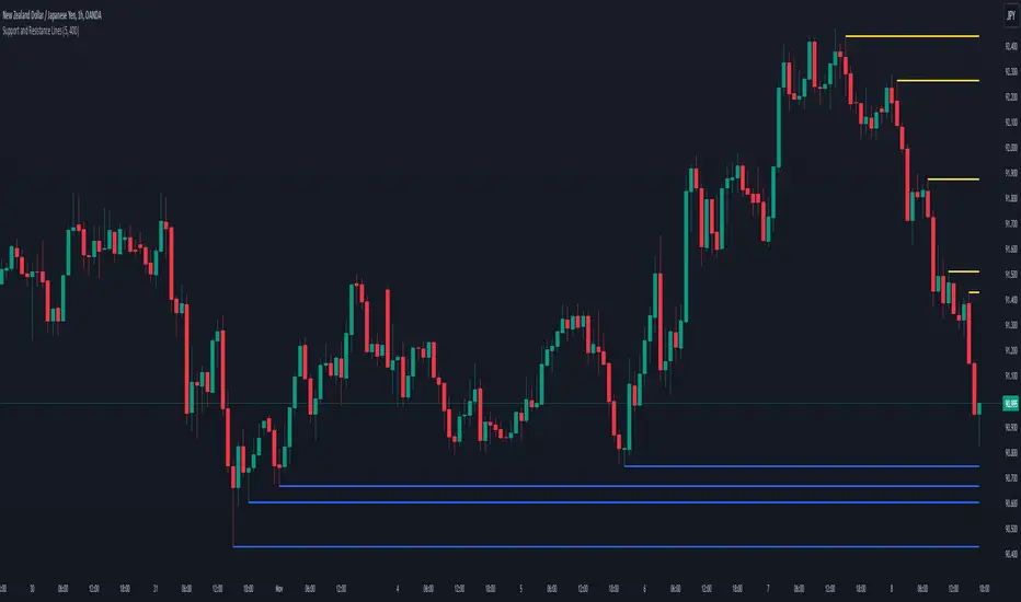 This script dynamically identifies and plots support and resistance levels on the chart using recent highs and lows. The indicator is fully customizable, allowing traders to adjust sensitivity and the number of bars analyzed, making it suitable for different timeframes and trading strategies.What It Does