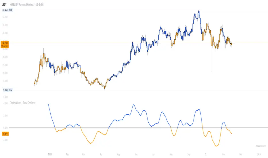 Trend Oscillator is a simple yet effective trend identification tool that uses the relationship between two exponential moving averages (EMAs) to determine market direction. It calculates the spread between a fast and slow EMA, applies a bias multiplier, and smooths the result to produce a clean oscillator that oscillates above and below a zero line. When the oscillator is above zero, the trend is considered bullish (upward); when below zero, it's bearish (downward). The indicator provides clear visual feedback through color-coded plots and optional price bar coloring, making it easy to identify trend direction at a glance.