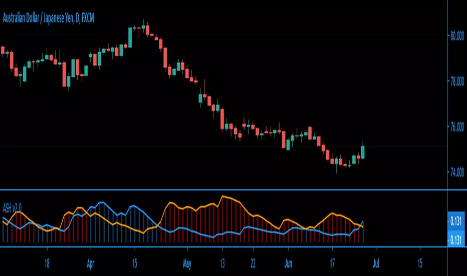 Absolute Strength Histogram is composed of two separate signals - Bulls and Bears. Both signals are plotted on the same graph. By doing so we can see the strength of the buyers and sellers in comparison to one another. When the Bulls Signal is above the Bears Signal, the histogram is blue and the market tends to be trending up (go long). When the Bears Signal is above the Bulls Signal, the Histogram turns red and the market tends to be trending down (go short).