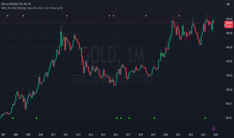 Arrow indications are drawn on the chart to indicate the trading conditions met in the script - green arrow for a buy signal indication and orange for LTF crossunder to indicate setting of SL.