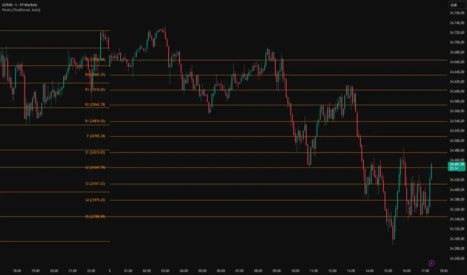 This indicator calculates and displays pivot point levels using multiple standard methodologies, including Traditional, Fibonacci, Woodie, Classic, DM, and Camarilla.