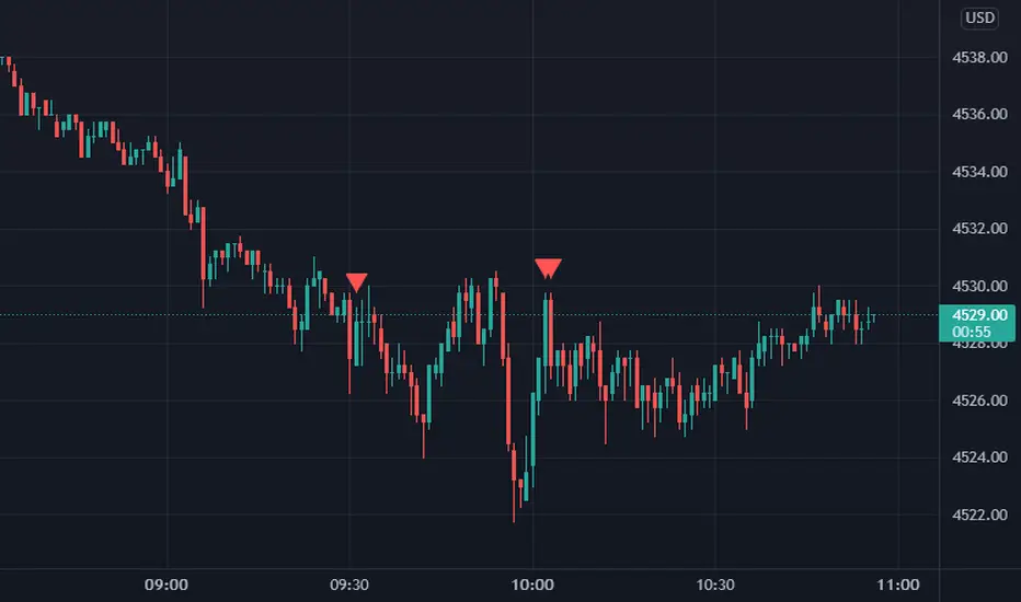 This plots green up arrows when the TICK index goes to -1,000 or lower or red down arrows when the TICK index goes +1,000 or higher. Can be used as a short term reversal signal (not investment advice). Will unfortunately plot on all charts but should only be relevant for US equity indices, mainly S&P500/ES futures. Indicator will adapt to the charts time frame and is hard coded to only show during 9:30-16:00 EST.