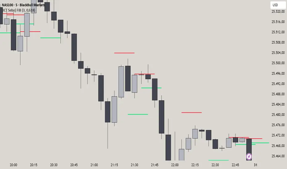 Using a simple two-candle reversal structure, the script identifies completed low-to-high and high-to-low swings and calculates a configurable Fibonacci retracement level (e.g. 0.618) between the swing points. The selected Fibonacci level is then projected forward for a fixed number of bars to highlight potential pullback and reaction zones.