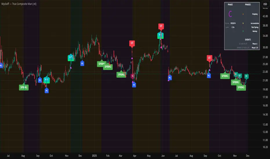 Wyckoff — True Composite Man (v6) is a full market-structure engine designed to detect authentic Wyckoff accumulation and distribution events directly on the chart.