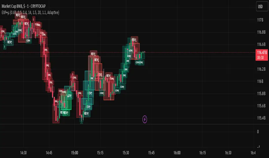 Draws colored rectangular "explosion frames" directly on the chart around triggering candles. Labels show direction and type (REV↑, CON↓, ↑/↓) with optional score. Intensity-based coloring ranges from mild to extreme bull/bear.