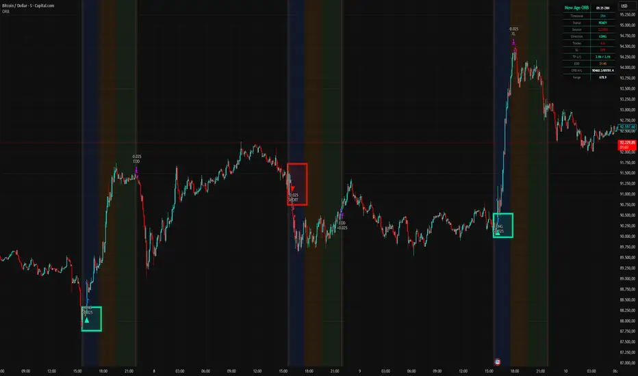 The New Age US ORB is a clean, professional Opening Range Breakout (ORB) strategy with a futuristic visual style featuring dynamic neon glow effects.