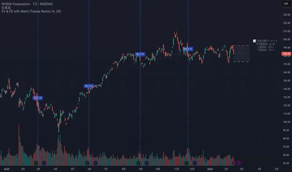 このインジケーターは、個別株(NVDA, TSLA, AAPLなど)の過去の決算発表時の価格変動(ボラティリティ)を分析し、次回の決算や重要イベントで想定される「価格の到達範囲(期待値ゾーン)」をチャート上に可視化します。