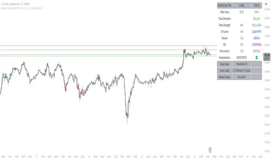 WeAxes SMC Pro is a comprehensive trading indicator that combines Smart Money Concepts (SMC) with multi-timeframe trend analysis. This powerful tool helps traders identify high-probability setups by aligning price action, market structure, and momentum across different timeframes.
