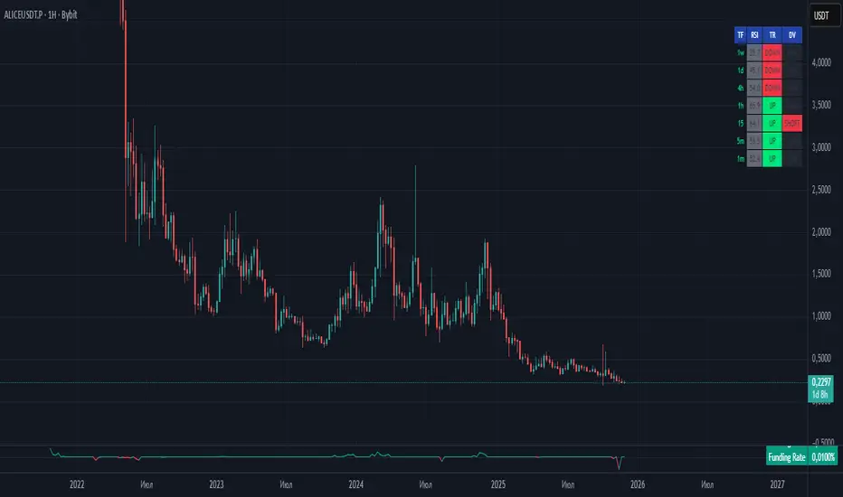 Этот индикатор собирает ключевую информацию по RSI и дивергенциям сразу на нескольких таймфреймах и выводит её в компактную таблицу прямо на графике. Он рассчитывает RSI и дивергенции внутри каждого таймфрейма отдельно, поэтому данные остаются точными и одинаковыми вне зависимости от того, какой ТФ у вас открыт.