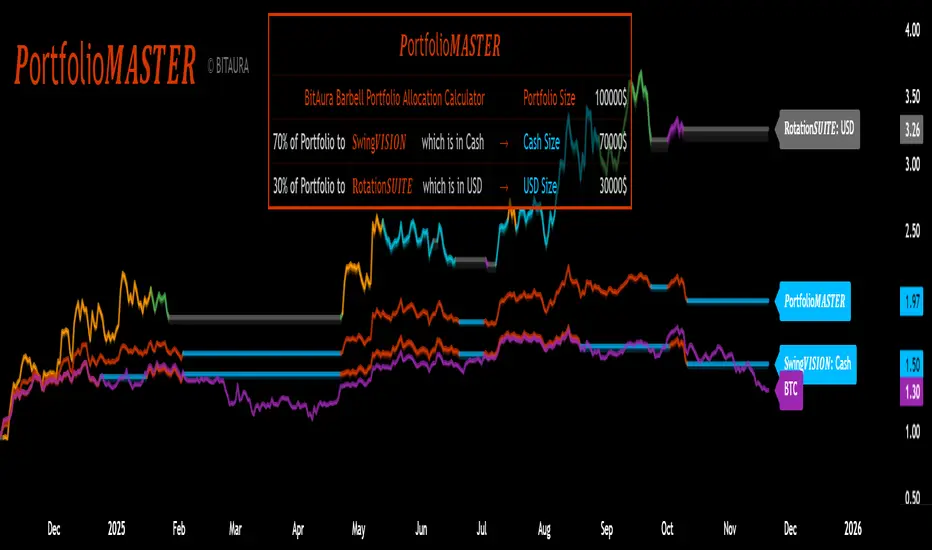 This Pine Scriptยฎ indicator is meant to be used to manage a Barbell Portfolio composed of BitAura's various strategies in order to create a risk-reward balance for the investor's needs. The Portfolio is divided in two main parts, one being a lower-risk Bitcoin-only strategy while the other being the higher-risk, higher-reward ๐otation๐บ๐ผ๐ฐ๐ป๐ฌ V3 system. The user can choose the percentage splits between these two systems and then also configure them based on their risk profile.