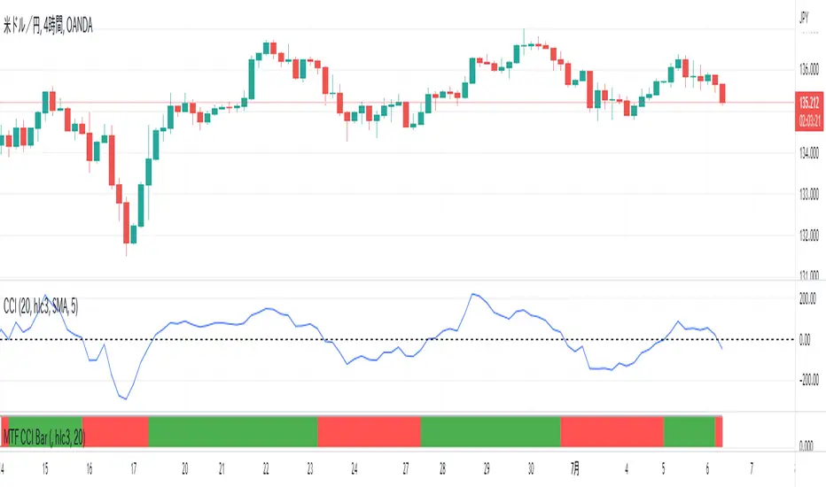 This indicator shows whether Commodity Channel Index (CCI) is above or below 0, represented by a bar. This indicator is compatible with MTF.